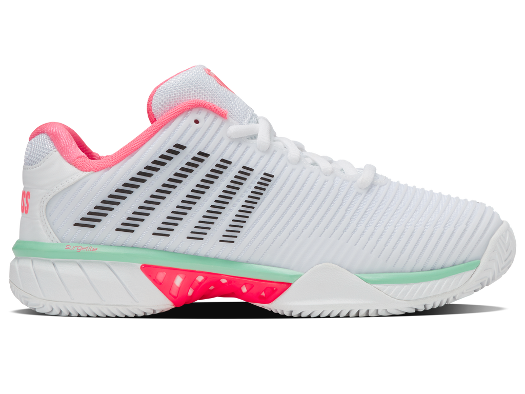 K-Swiss' best-selling shoe, the Hypercourt Express 2, is light, comfortable, breathable, and has a generous fit, making it the ideal choice for a variety of playing styles and levels. Durawrap Flex, gives the shoe support with no break-in period, while Surgelite midsole technology provides all-day comfort. The shoe also features a deep grooved herringbone outsole for exceptional traction on clay court surfaces!