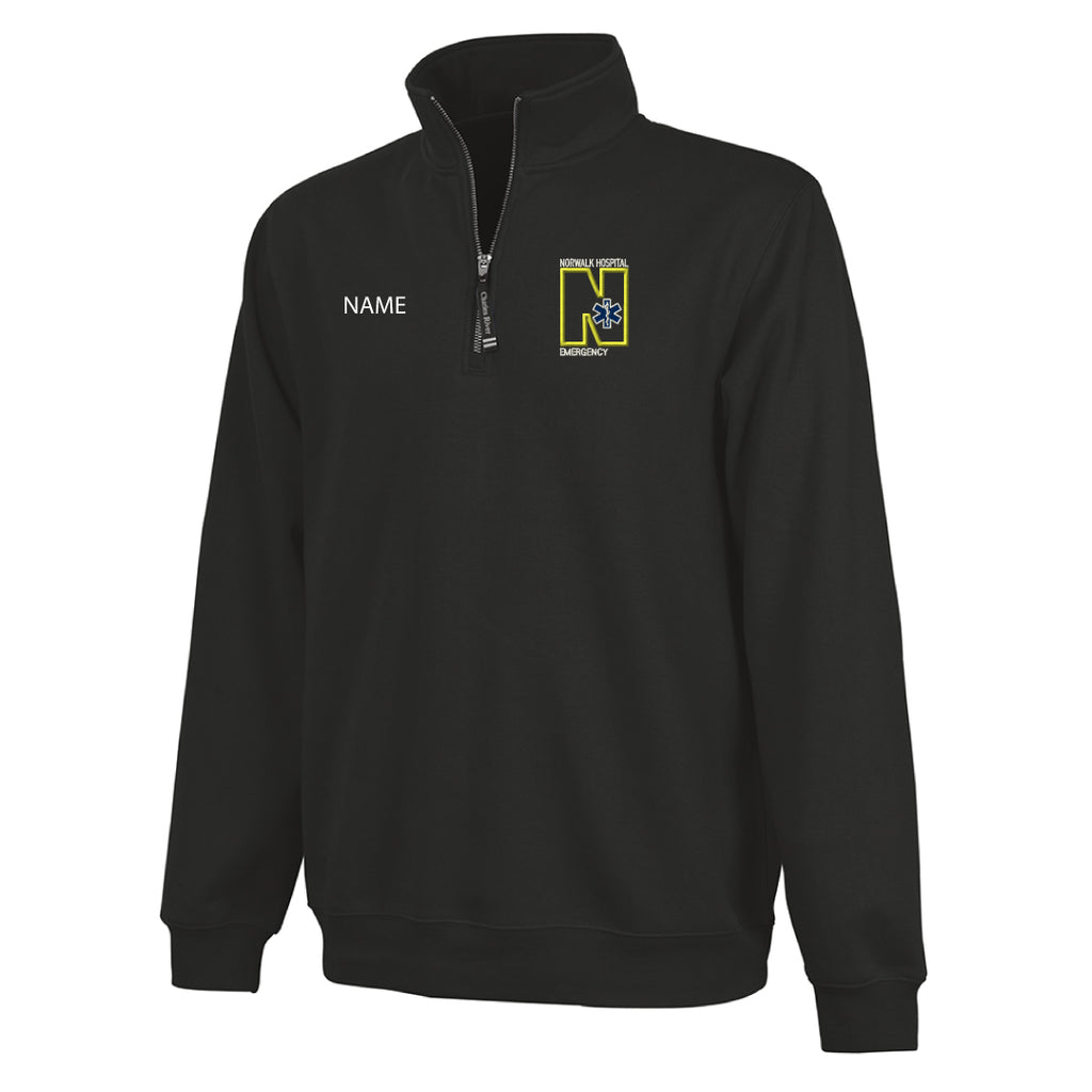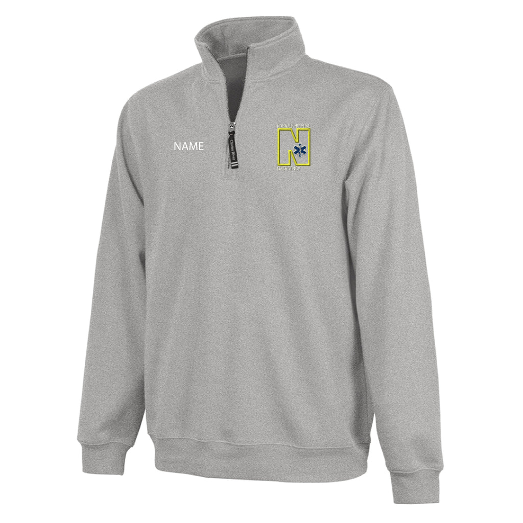 - Relaxed quarter zip sweatshirt styling with convenient on-seam pockets